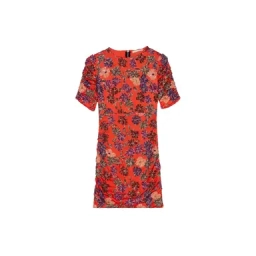Mauve printed knitted fit and flare dress, has a round neck, three-quarter sleeves, concealed zip closure. flared hem